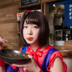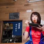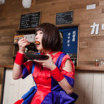 カレーを食べ始めて中盤、トッピングのエビフライを食べることで、口の中に別の風味と食感が広がる。ライブに例えるならばMCの時間といったところだろうか。彼女の可愛さもカレーもしっかり写っている一枚。(カリガリ二木)