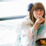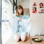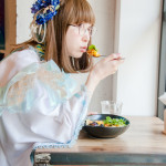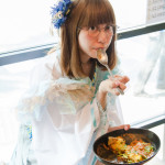 そして、机の上で正座して……という不思議な状況ながら、それがまるで宙に浮いた板間のようにも見え、独特な和テイストの衣装とも相まって、神に仕える巫女さんのよう。カレーへの敬愛をとても表している1枚だ。(アライトシロウ)