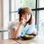 もとより透明感のある彼女。この写真ではカレーを食べているというよりも、まるで妖精が花の蜜を吸っているかのような不思議な印象を受ける。目線、スプーンを持つ手、カレー、ヘアアクセへ視点を移動するとその後ろに「人はいなくなる」という文字。やはりこの瞬間、彼女は人ではなくカレーの妖精だったのだろう。(カリガリ二木)